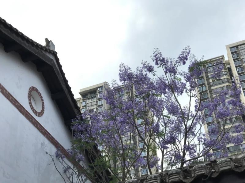 相見,總在不經(jīng)意間。 于一片灌木中,于建筑物的墻邊, 藍(lán)花楹撐開手中傘,投落道道暗香悠遠(yuǎn)。