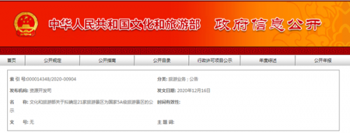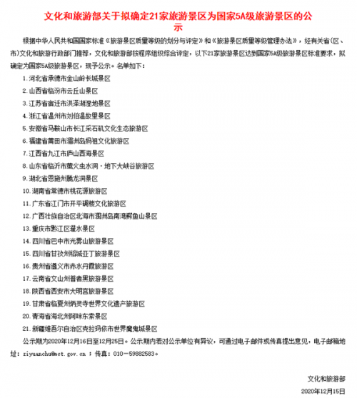 文化和旅游部關(guān)于擬確定21家旅游景區(qū)為國(guó)家5A級(jí)旅游景區(qū)的公示